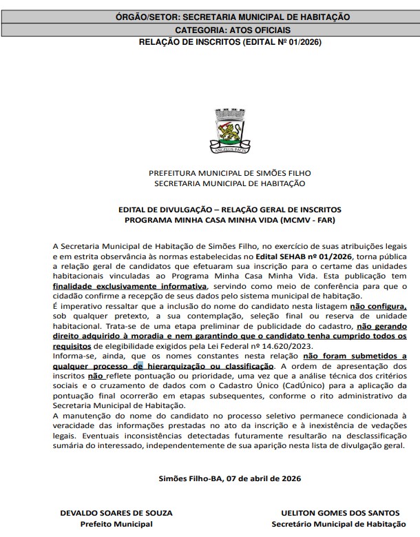 A divulgação da lista geral de inscritos no programa Minha Casa Minha Vida, feita pela Prefeitura de Simões Filho, movimentou milhares de famílias que sonham com a casa própria. Com mais de 14 mil cadastros registrados, a expectativa é grande — mas também exige atenção redobrada dos participantes.